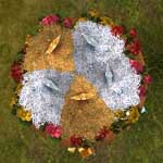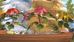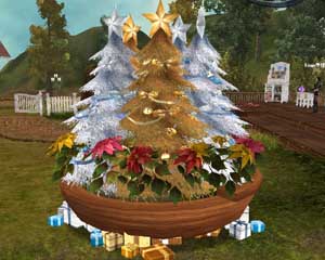 ラウンドベッドを鉢に見立て、ツリーと大型ポインセチアを寄せ植えのごとく盛りました