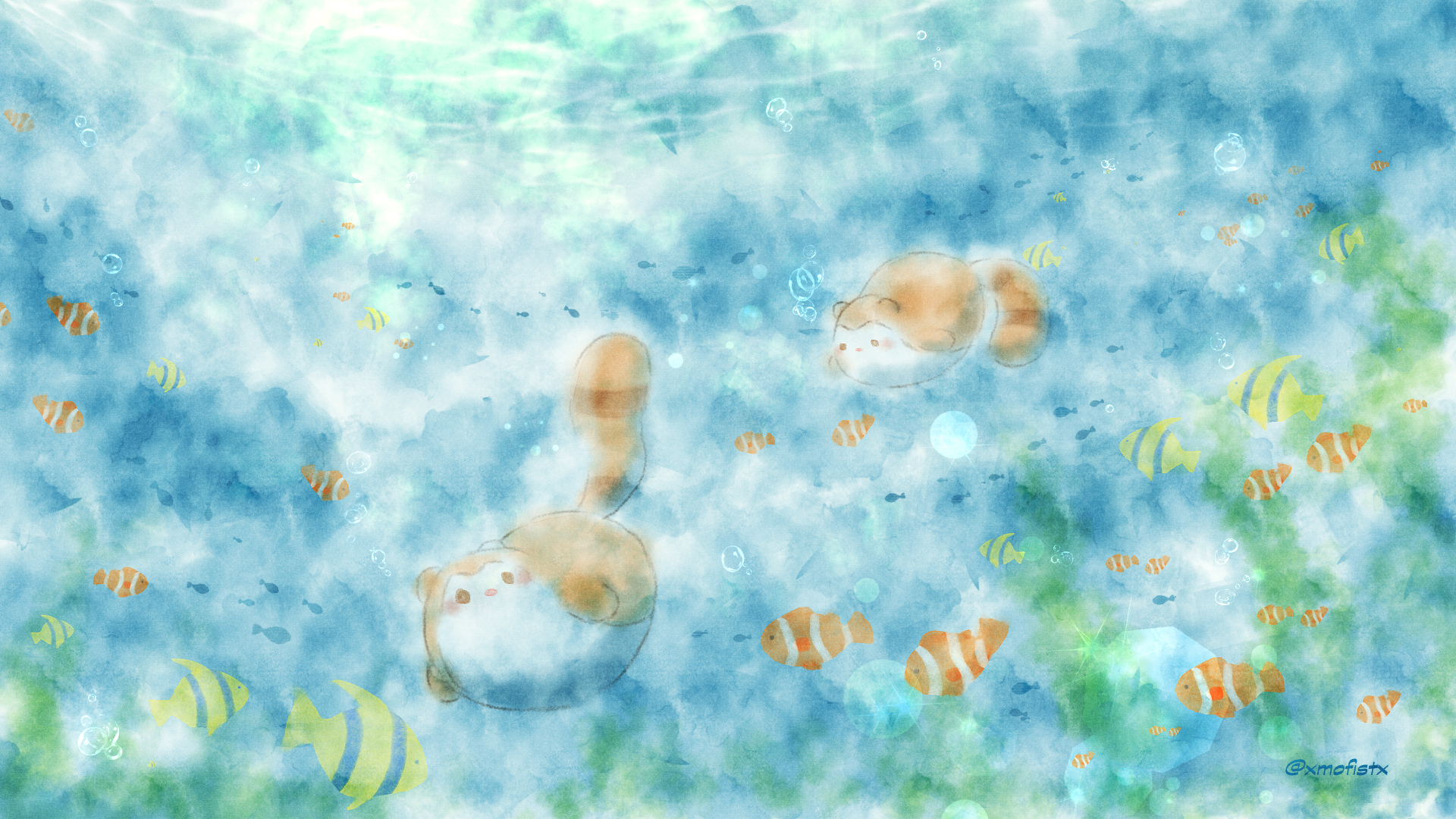 水彩風の、海で泳ぐもふ達