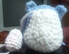 おなか~顔の模様は糸の色を変えて編み目で表現するか、別に編んで縫いつけるか・・・